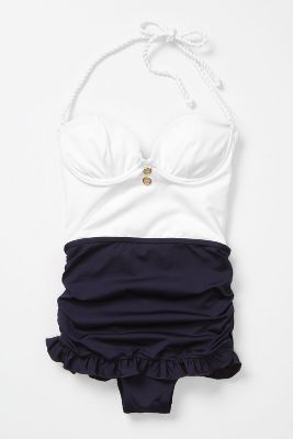 For something a little more modest, this shapely one piece comes in a variety of colors. I personally love the vivid poppy, but red bathing suits are easily admired and not so easily worn. The side ruching, underwire cups and thick halter of this navy number is pretty and flattering.